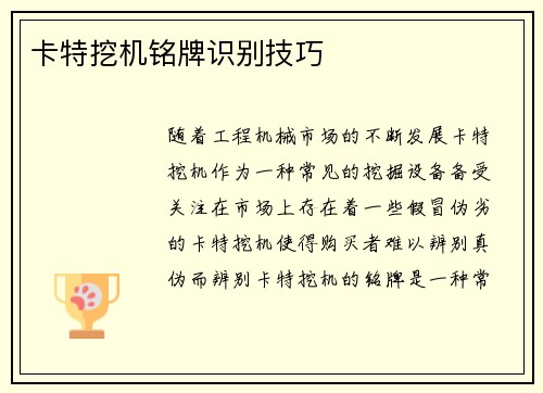 随着工程机械市场的不断发展,卡特挖机作为一种常见的挖掘设备,备受关注。在市场上存在着一些假冒伪劣的卡特挖机,使得购买者难以辨别真伪。而辨别卡特挖机的铭牌是一种常见的方法,本文将介绍如何辨别卡特挖机铭牌,以帮助读者更好地辨别真伪。