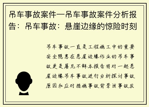 吊车事故一直是工程施工中的重要安全隐患。在悬崖边缘作业的吊车事故更是屡见不鲜。本报告将对一起悬崖边缘吊车事故进行分析,探讨事故原因和应对措施。