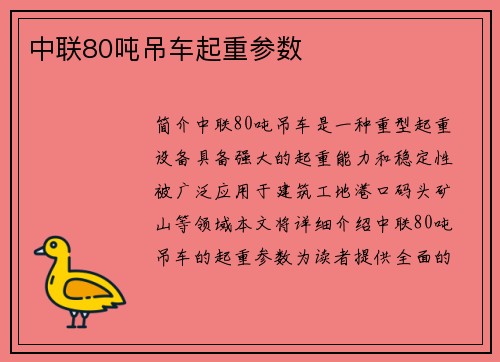 中联80吨吊车是一种重型起重设备,具备强大的起重能力和稳定性,被广泛应用于建筑工地、港口码头、矿山等领域。本文将详细介绍中联80吨吊车的起重参数,为读者提供全面的了解和参考。