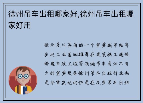 徐州是江苏省的一个重要城市,经济发达,工业基础雄厚。在建筑施工、道路修建、市政工程等领域,吊车是必不可少的重要设备。徐州吊车出租行业也是非常发达的。但是在众多吊车出租公司中,很多客户往往不知道该如何选择。那么,徐州吊车出租哪家好呢?下面就为大家介绍一下。